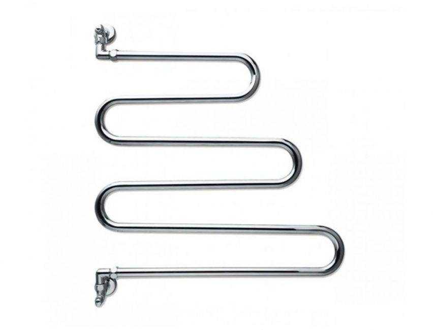 Выполнен в форме нарастающей вверх змейки, с плавно уменьшающейся шириной секций. Максимальная ширина у нижней перекладины – 60 см. Полотенцесушитель снабжен поворотным механизмом, это позволяет перемещать его вокруг оси на 180°.