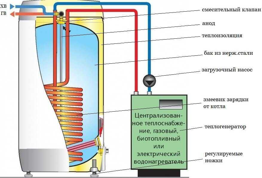 В конструкцию и комплектацию агрегата входят: корпус, состоящий из внешнего кожуха, утеплителя и внутреннего бака; змеевик-теплообменник, магниевый анод и рециркуляционный патрубок; подвод/отвод для холодной/горячей воды и вход/выход для циркулирующего теплоносителя; насос, термометр, термостат, сливной кран, водный фильтр и трехходовой клапан; группа безопасности и блок управления. Крепится прибор вертикально в непосредственной близости от котла в специально предусмотренном помещении: объемом ≤ 200 л к капитальной стене, емкостью ˃ 200 л – к полу.