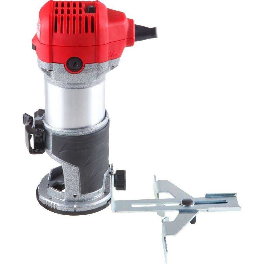 Окантовочный фрезер от ДеВольт, обладающий мощностью 900 Вт и выдающий от 16000 до 27000 оборотов в минуту. Их количество регулируется поворотным колесиком в верхней части корпуса. Максимальный диаметр фрезы разрешен до 36 мм. У цангового патрона распространенный размер 8 мм. Оснастка может опускаться вглубь заготовки до 5.5 см, поэтому кромочная машина подходит для работы с толстыми досками. Плавный пуск устраняет рывок на старте и позволяет изначально размещать фрезер на заготовке. При меняющейся нагрузке, обороты удерживаются в заданном количестве. Хотя в комплекте к нему не прилагаются расходники, зато есть прозрачный патрубок для подключения системы пылеудаления. Покупатели хвалят в отзывах высокое качество сборки и стабильность удержания заданного размера при выборке.