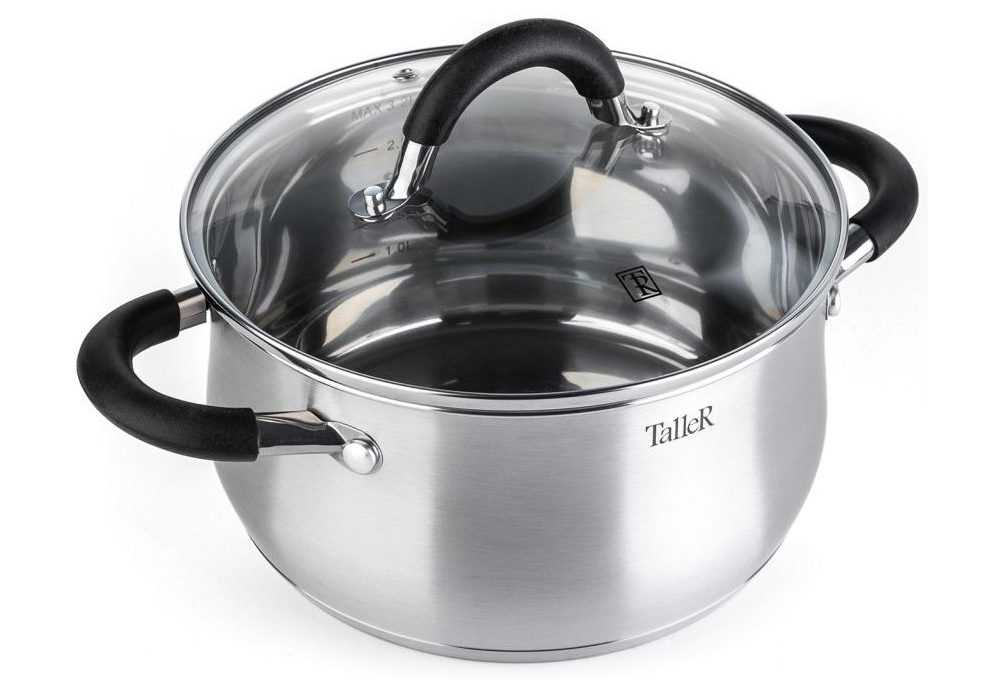 Классическая округлая модель, выполненная в традиционном английском стиле. Конструкция дна капсулированая, оснащена вставкой из алюминия, что позволяет равномерно распределять тепло. В комплект входит крышка из огнеупорного стекла, которая снабжена отверстием для отвода пара и плотно прилегающим стальным ободком. Taller Шелборн подходит для индукционной плиты, но в духовой шкаф ее не поставить – мешают боковые ручки. Диаметр составляет 200 мм. Дополнительно обладает мерной шкалой. Ручки оборудованы силиконовыми накладками. Средняя стоимость составляет – 2 052 руб.