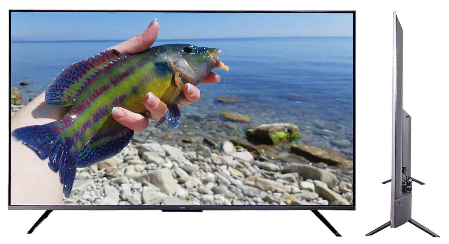 Модель с размером экрана 55″ и разрешением 4K UHD. Он оснащен операционной системой Андроид 9.0. Корпус опирается на две ножки и имеет тонкую черную рамку. Яркость картинки 300 кд/м², динамический контраст 140000:1.