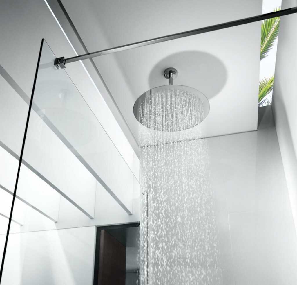 - Душ без душевого поддона, отделенный от остальной комнаты отдельно стоящей душевой перегородкой, обычно довольно просторный. Благодаря этому вы можете установить тропический душ любого размера, даже диаметром от 40 см и более.